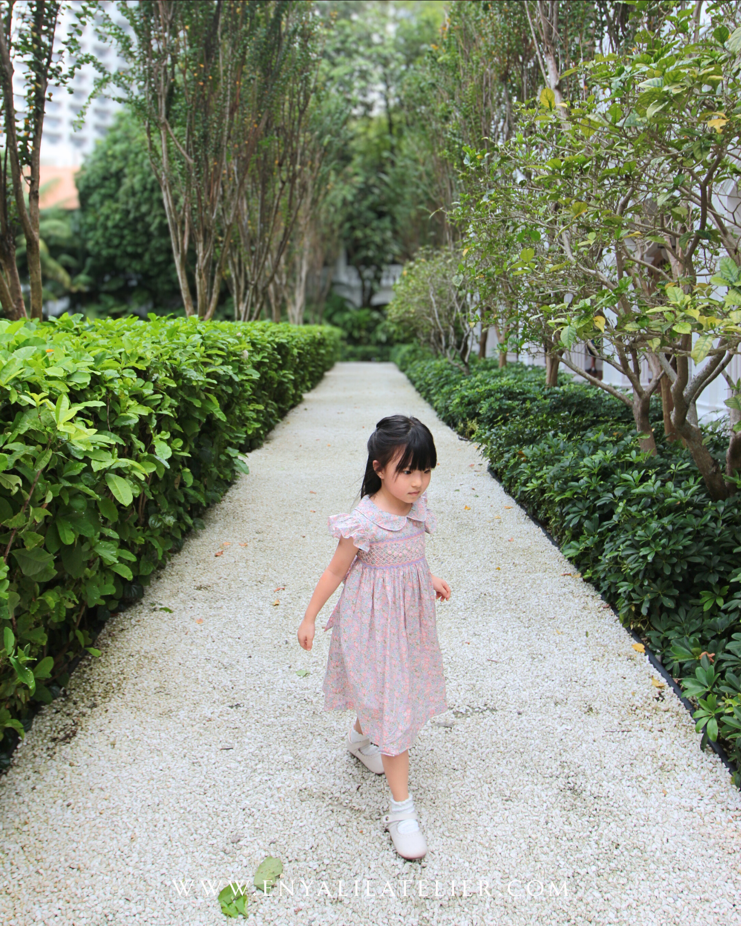 Tasya dress features our signature smocked dress design with a feminine silhouette characterized by flutter sleeves and a vintage Peter Pan collar. It is adorned with intricate rose and daisies embroideries across the chest.